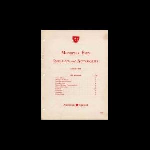 Trade catalogue, printed in red on white. Six pages, stapled and triple hole-punched. Includes terms of sale and prices in US dollars for Monoplex Stock Eyes, special services, stock eye units, custom made and prescription eyes, cosmetic cover lenses, implants, conformers, accessories and fitting charges.