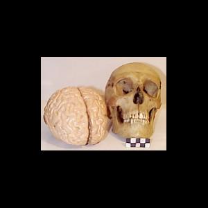Plastic sectional model of the human brain, collapsible into its cerebral hemispheres, and brain stem. Also a real dissected human skull with wires, hooks and springs to permit articulation. The skull cap lifts off to reveal the cranial vault. The grooved lacrimal bone is missing in both orbits but the right optic canal is still present.