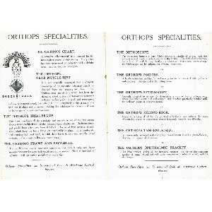 Advertisement for a range of ophthalmic instrumentation available from various wholesale optical houses. Double-page spread comprising pages 2-3 of an advertising supplement to an optical text book. Printed in black and white, with one line drawing of an Orthops Chart. Featured products: Orthops Chart, Orthops Near Muscle Test, Orthops Trial Frame, Orthops Frame and Face Rule, Orthoscope, Orthops Pointer, Orthops Retinoscope, Orthops Record Book, Orthops Tangent Scale, Orthops Ophthalmic Bracket.