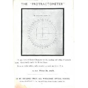 Advertisement for a manufacturer of ophthalmic instruments. Page 14 of an advertising supplement to an optical text book. Printed in black and white, with product photograph/drawing and price for an optical protractor for the checking and setting of spectacle lenses.