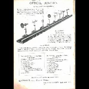 Advertisement for a manufacturer of ophthalmic instruments. Page 16 of an advertising supplement to an optical text book. Printed in black and white, with product photograph/drawing and prices for optical demonstration benches. Includes specifications for the No 1 bench (illustrated - as used by Dr Ettles at the Northampton Institute) and smaller No 2 bench.