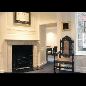 Photographic print, landscape format, of the College Ante-Room fireplace with the Grant of Arms and the President's Chair.
