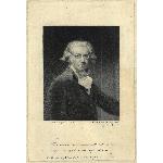 Monochrome print (mezzotint engraving) of the artist Sir Joshua Reynolds wearing spectacles. A verse of Seneca is appended beneath. Very wide border.