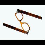 Unusual folding spectacles comprising a flat light amber shell front with regular bridge, encased within two hollowed out sides which fold out and swivel to form a wearable device. Straight sides with textured inner tips for grip.