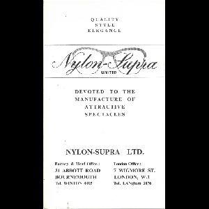 Leaflet promoting nine special-purpose spectacle frames. Small portrait format printed in black and white on ten panels, folded. Illustrated with black and white product photographs. Featured frames: The Abbott Reversible, The Dual Sight, The Everest Harris, The Nufold, The Angleset, The Houston, The Nylon Half-Eye, Nylon Supra, The Supratone.