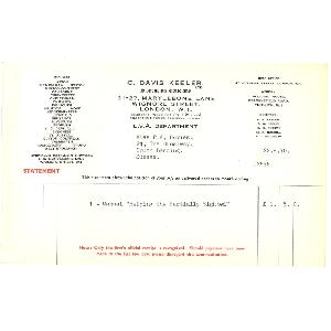 Account statement issued by the LVA department of C. Davis Keeler Ltd to an independent optometrist, Miss P.A. Davies, noting the purchase of a copy of the 'Helping the Partially Sighted' Manual. Small, landcape format, typewritten on pre-printed business stationery.