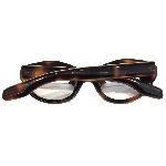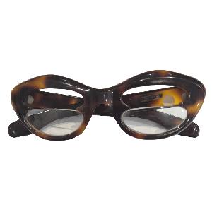 Spectacles. Dark brown mottled plastic library frame. Pad bridge. Embedded high joints. Thick, rounded, shallow drop-end sides. Wide eyes, glazed in lower portion only with glass prescription lenses. Manufacturer's stickers inside left side.