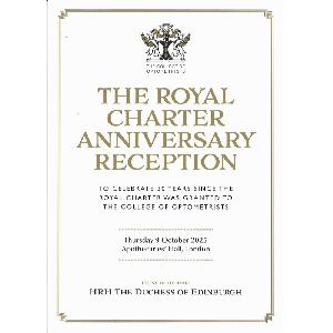 Programme for participants in the 30th Anniversary event for the College of Optometrists' Royal Charter, held at Apothecaries Hall on Thursday 9th October 2025 and at which event HRH the Duchess of Edinburgh was presented with Honorary Fellowship of the College. A5 portrait format printed in colour on four sides, folded, including an historical timeline of the College since 1981 and a welcome text from the College President, Dr Gillian Rudduck.