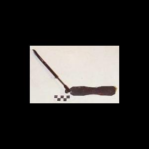'Maisette' eyeshade. Cellulose acetate (imitation shell). Shade backed with green material. Hinged to end of sliding lorgnette handle. Small ring at end of handle. No holding clips.
