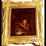 Framed painting (oil) of a man sharpening a quill pen at a writing desk. The whole scene set within an arch. Features a pair of nose spectacles. Gilt frame.