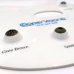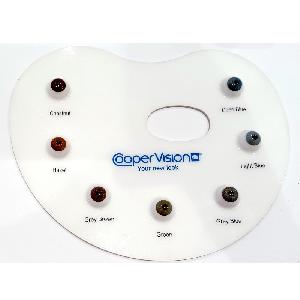 Promotional display of coloured cosmetic contact lenses in form of an artist's palette with seven colour samples on raised eye-shaped bases: Chestnut, Hazel, Grey Brown, Green, Grey Blue, Light Blue, Deep Blue. [Part of the Frequency Colors Demonstration Set].