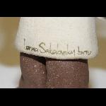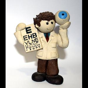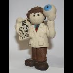 Figurine in stoneware clay, handsculpted and fired, depicting an optometrist in a short white coat and holding a test chart and an enlarged eyeball. Signed on the lower coat reverse with the artist's name and a Hebrew inscription.
