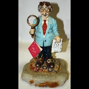 Figurine in painted soft metal, depicting an optometrist, wearing a blue coat and holding a magnifying glass and test letter chart. On his feet are animal slippers bearing spectacle frames. Four additional spectacle frames are arranged around the upper plinth whilst the optometrist wears a pair of spectacles himself, with a pair of sunglasses perched higher on his head and another pair of spectacles dangling on a chain from his neck. Irregularly shaped onyx base with round black felt underlay. Certificate of origin tied to right arm.