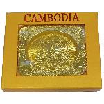 Souvenir plate with display stand and presentation box, from an optometric event in Cambodia. Oval form in pressed yellow metal depicting the temple of Angkor Wat, together with the slogan 'Kingdom of Wonder'. Black synthetic fibre backing, together with a two-part black plastic stand. Contained in a yellow cardboard box with transparent plastic window in lid. As presented to the College after its Lead Assessor, Sophie Harper, worked as a volunteer for the Khmer Sight Foundation in October 2019.