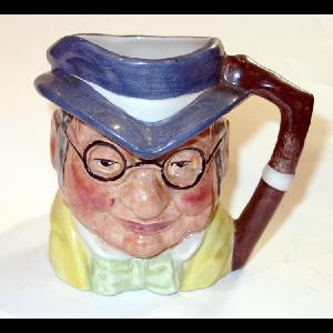 Ceramic Staffordshire ware character jug in form of Mr Pickwick (head and shoulders) wearing a blue-grey hat, yellow jacket, white shirt and green cravat. Features a pair of black round eye spectacles. Brown handle to side in form of a walking stick. Backstamp under base.