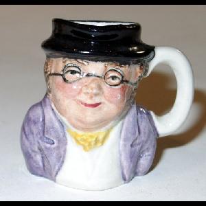 Ceramic Staffordshire ware character jug in form of Mr Pickwick (head and shoulders) wearing a black hat, light purple jacket, white waistcoat, shirt and yellow cravat. Features a pair of black round eye spectacles. Spout in hat. White handle to side. Backstamp under base.
