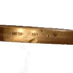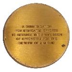 Brass plate on plastic stand. Central hole to take a commemorative medallion celebrating the 50th anniversary of the International Optical and Optometric League (IOOL). Medallion features, on the obverse, a laurel wreath surrounding the number 50 and a further eight lines of text and, on the reverse five simple lines of text.