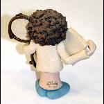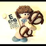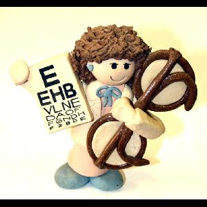 Figurine in stoneware clay, handsculpted and fired, depicting a female optometrist in a white coat and holding a test chart and an enlarged pair of spectacles. Signed on the lower skirt reverse with the artist's name and a Hebrew inscription.