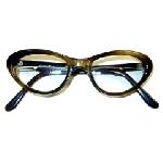 Spectacles. Dark brown and olive green mottled plastic frame. Pad bridge. Embedded high joints. Reinforced drop-end sides. Upswept eyes, glazed in lower portion only.