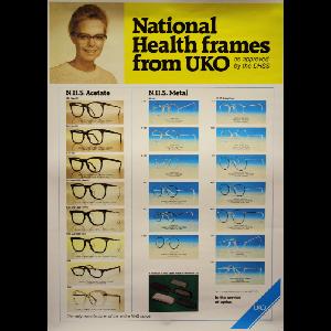 Colour poster illustrating and describing eight acetate NHS spectacle frames: 524 (Newfit), 524 (Unifit), 524 (66), 525 and C525 (Newfit), 525 and C525 (Unifit), 525 and C525 (66), 824 and 924; and ten metal NHS spectacle frames: C121, C122, C127, C222, C223, C227, 321, 322, 421, 422, 423, 721 and 722, comprising the entire NHS range as available in the mid 1980s. Includes also a photograph of a selection of NHS cases by Willmotts Ltd.