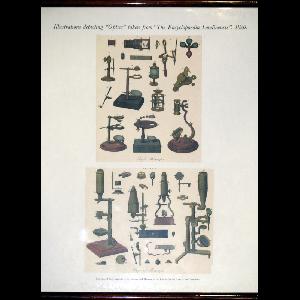 Poster reproducing modern colour prints of two pages from the 19th century 'Encyclopedia Londoniensis'. Includes illustrations and diagrams relating to microscopes. Mounted together on a board. In a modern polished wooden frame, glazed.