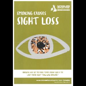 Public information poster for use by opticians during National Eye Health Week 2017. A3 portrait format, printed in colour, with a white border. Features a graphic image of a stylised eye, the iris comprising a photograph of used cigarette stubs, against a plain olive green background, plus a commentary that smokers are up to four times more likely to lose their sight than non-smokers.
