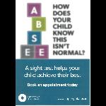 Public information poster for use by opticians. A3 portrait format, printed in colour. Features a message in blurred lettering shown against children's building blocks similarly bearing blurred letters, plus a recommendation to book a sight test appointment. Reverse features '5 Ways to protect your children's eyes'.