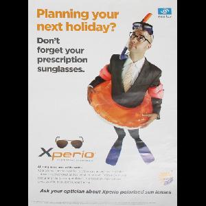Poster promoting the Xperio brand of polarised ophthalmic sun lenses and urging prospective travellers not to forget their prescription sunglasses. A2 portrait format, printed in colour. Features photograph of a bespectacled businessman also wearing an inflated rubber ring, flippers and scuba-diving gear.
