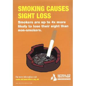 Public information poster for use by opticians during National Eye Health Week 2019. A4 portrait format, printed in colour, with a white border. Features a graphic image of an ashtray with a stubbed-out cigarette, against a plain orange background.