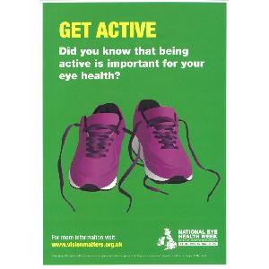 Public information poster for use by opticians during National Eye Health Week 2019. A4 portrait format, printed in colour, with a white border. Features a graphic image of a pair of purple training shoes, against a plain green background.