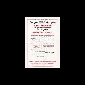 Poster advising members of the public to ensure that their medical card includes their National Health Service number. Printed in black and red.